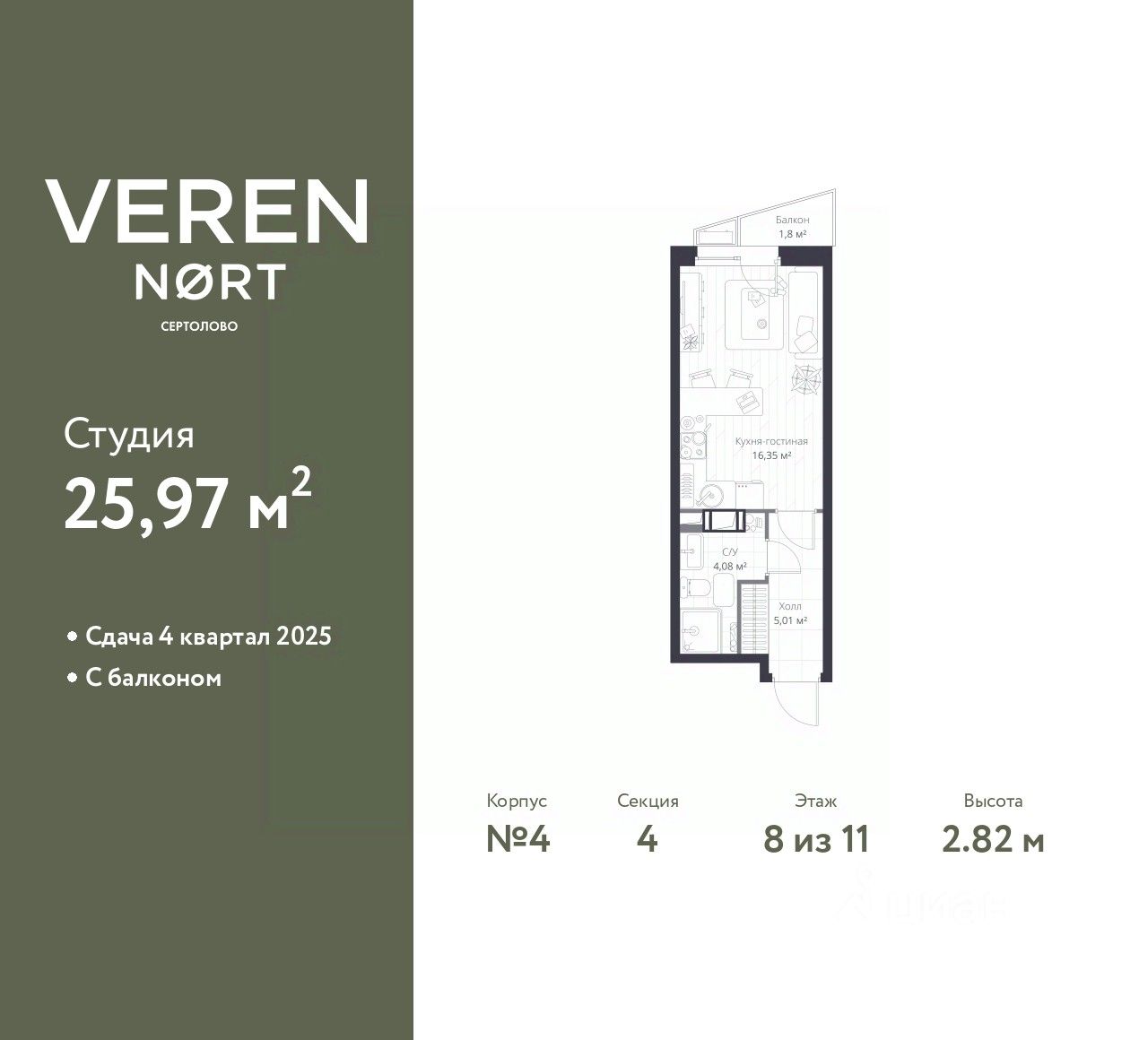 Продается 1-комн. квартира-студия от застройщика в Veren Nort Сертолово на 8 этаже. Квартира без отделки, после оформления собственности можно делать ремонт. Общая площадь: 25.97 кв.м., площадь гостиной 16.34 кв.м., из которых 3 кв.м. выделено под кухонную зону. Все окна выходят на одну сторону. В квартире один балкон, один совмещенный санузел. Высота потолков 2.82 м.