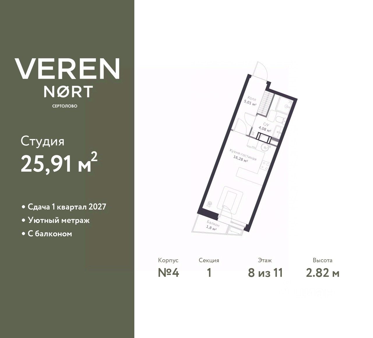 Однокомнатная квартира-студия в Veren Nort Сертолово на 8 этаже. Квартира без отделки, после оформления собственности можно делать ремонт. Общая площадь: 25.91 кв.м., площадь гостиной 16.28 кв.м., из которых 3 кв.м. выделено под кухонную зону. Все окна выходят на одну сторону. В квартире один балкон, один совмещенный санузел. Высота потолков 2.82 м.