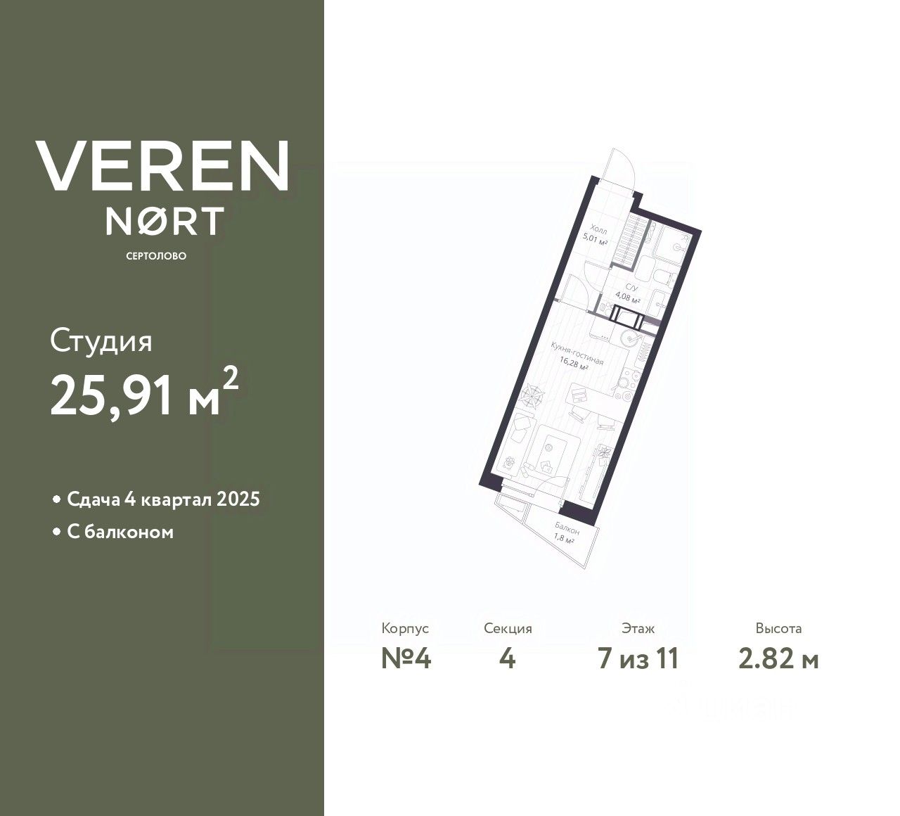 Однокомнатная квартира-студия в Veren Nort Сертолово на 7 этаже. Квартира без отделки, после оформления собственности можно делать ремонт. Общая площадь: 25.91 кв.м., площадь гостиной 16.28 кв.м., из которых 3 кв.м. выделено под кухонную зону. Все окна выходят на одну сторону. В квартире один балкон, один совмещенный санузел. Высота потолков 2.82 м.