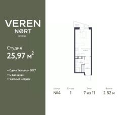 Однокомнатная квартира-студия от застройщика в Veren Nort Сертолово на 7 этаже. Квартира без отделки, новый владелец может сделать ремонт по индивидуальному проекту. Общая площадь: 25.97 кв.м., площадь гостиной 16.34 кв.м., из которых 3 кв.м. выделено под кухонную зону. Все окна выходят на одну сторону. В квартире один балкон, один совмещенный санузел. Высота потолков 2.82 м.