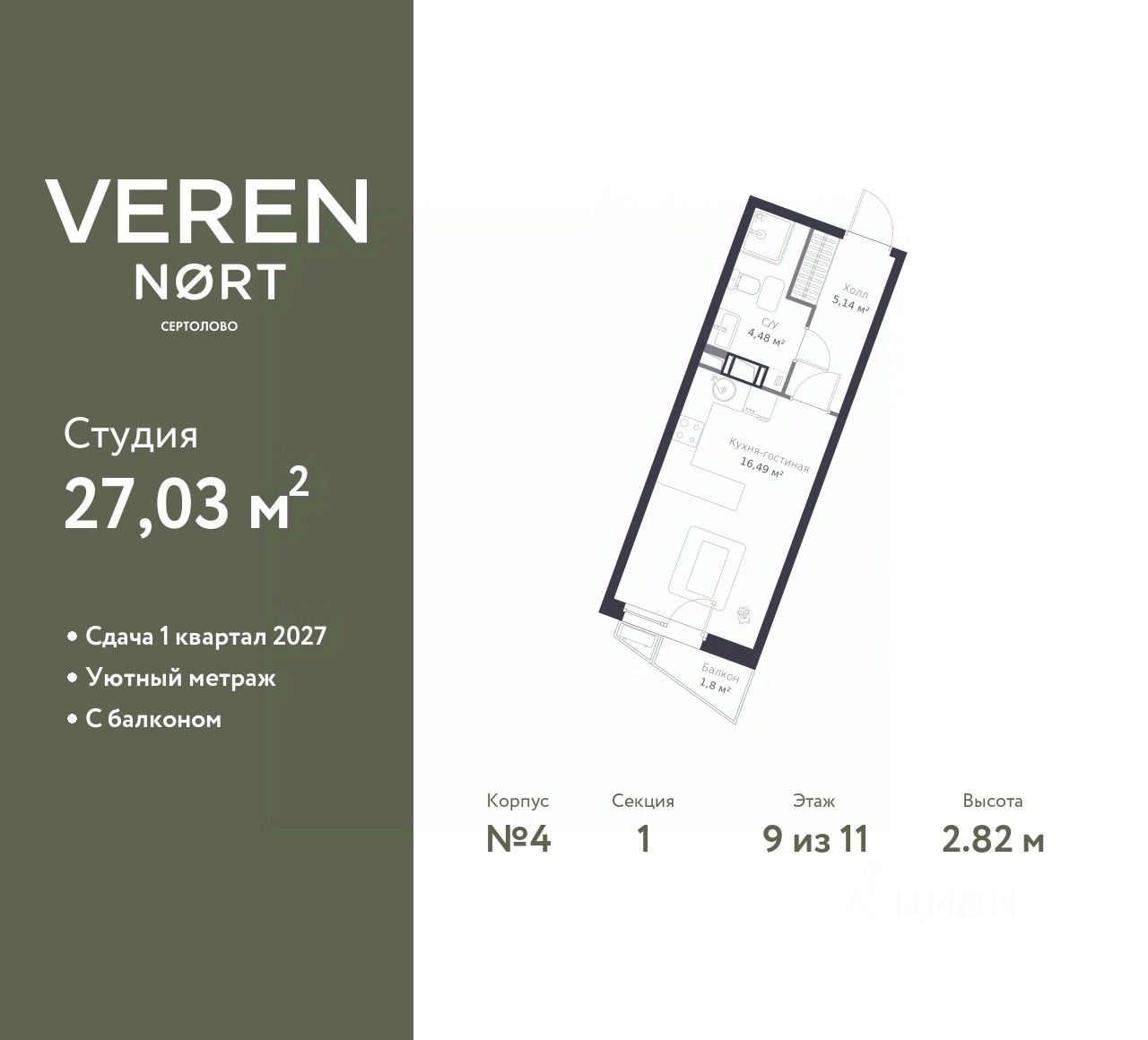 Просторная однокомнатная квартира-студия в Veren Nort Сертолово на 9 этаже. Квартира без отделки, после выдачи ключей можно делать ремонт. Общая площадь: 27.03 кв.м., площадь гостиной 16.49 кв.м., из которых 3 кв.м. выделено под кухонную зону. Все окна выходят на одну сторону. В квартире один балкон, один совмещенный санузел. Высота потолков 2.82 м.