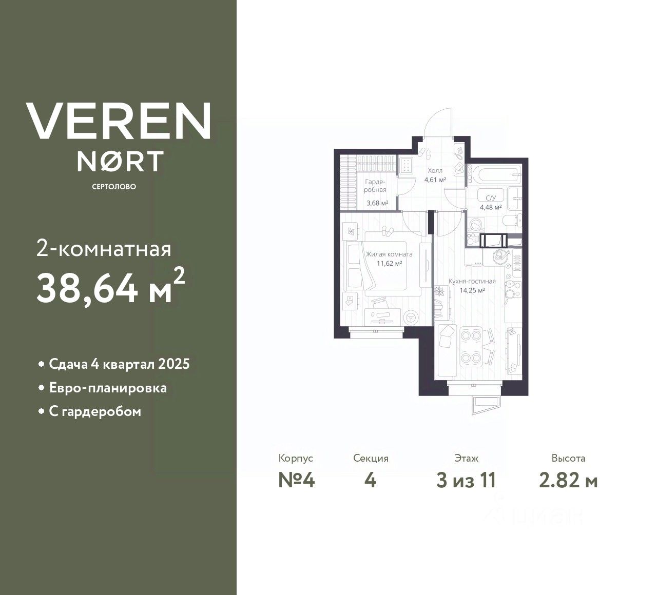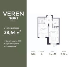 Однокомнатная квартира от застройщика в Veren Nort Сертолово на 3 этаже. Квартира без отделки, после оформления собственности можно делать ремонт. Общая площадь: 38.64 кв.м., жилая: 11.62 кв.м., площадь просторной куxни-гостиной: 14.25 кв.м. Все окна выходят на одну сторону. В квартире один совмещенный санузел. Высота потолков 2.82 м.