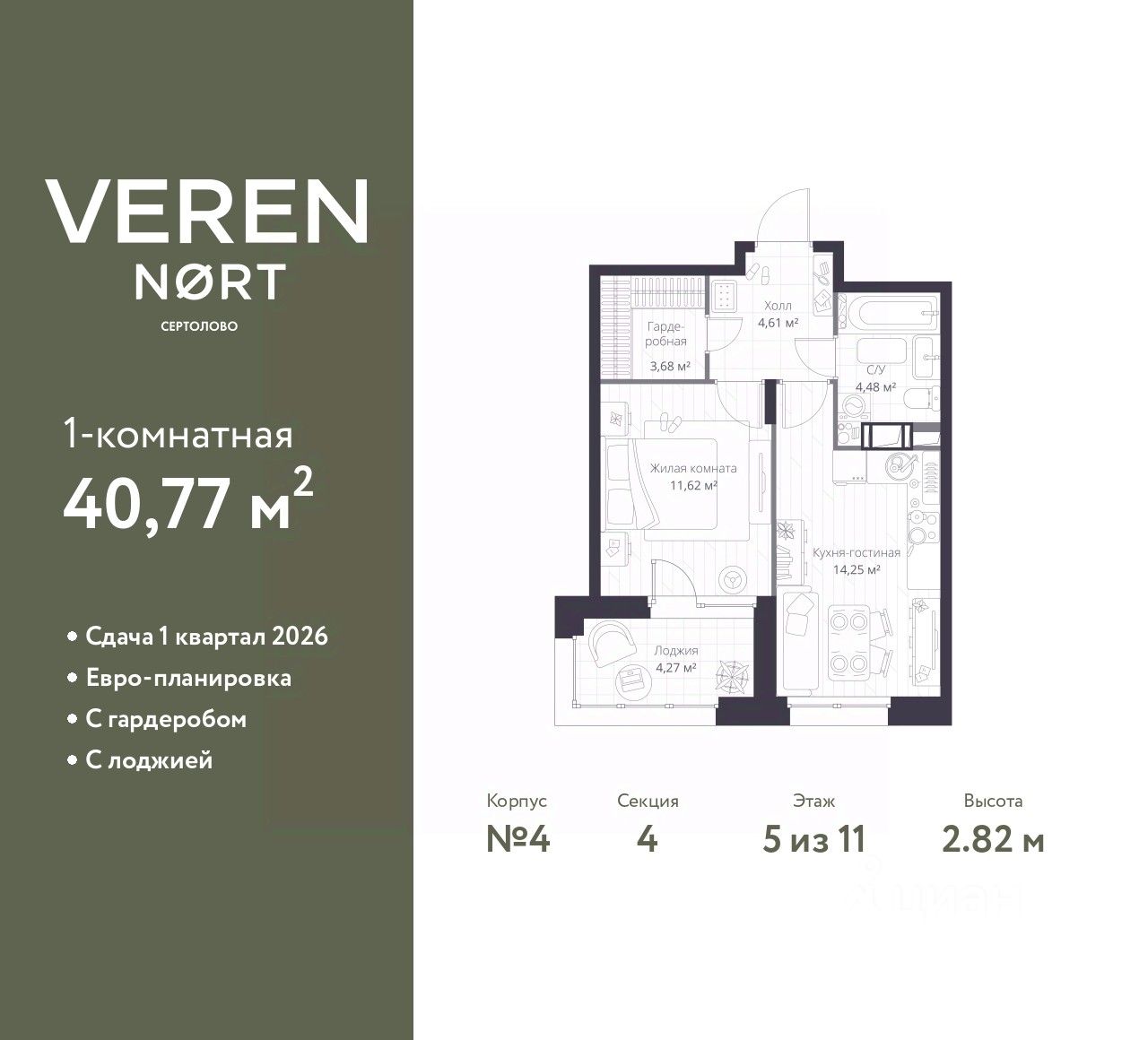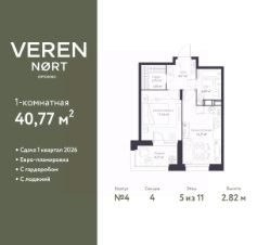1-комн. квартира в ЖК "Верен Норт Сертолово" на 5 этаже. Квартира без отделки, полностью готова к ремонту. Общая площадь: 40.77 кв.м., жилая: 11.62 кв.м., площадь просторной куxни-гостиной: 14.25 кв.м. Все окна выходят на одну сторону. В квартире одна лоджия, один совмещенный санузел. Высота потолков 2.82 м.