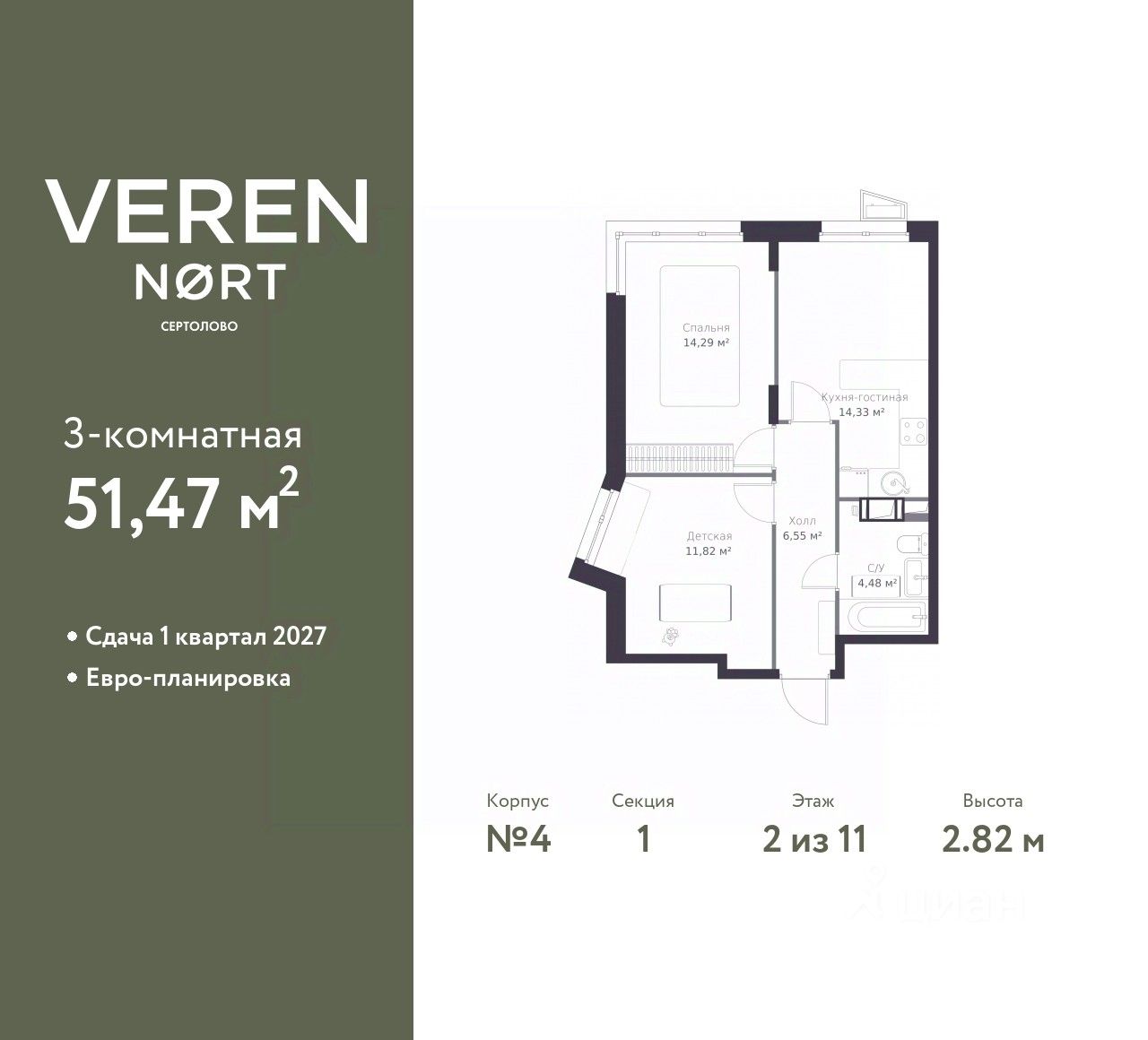2-комн. квартира в Veren Nort Сертолово на 2 этаже. Квартира без отделки, новый собственник может сделать ремонт по своему проекту. Общая площадь: 51.47 кв.м., жилая: 26.11 кв.м., площадь просторной куxни-гостиной: 14.33 кв.м. Квартира угловая, идеально подойдет любителям тишины и панорамных видов. В квартире один совмещенный санузел. Высота потолков 2.82 м.