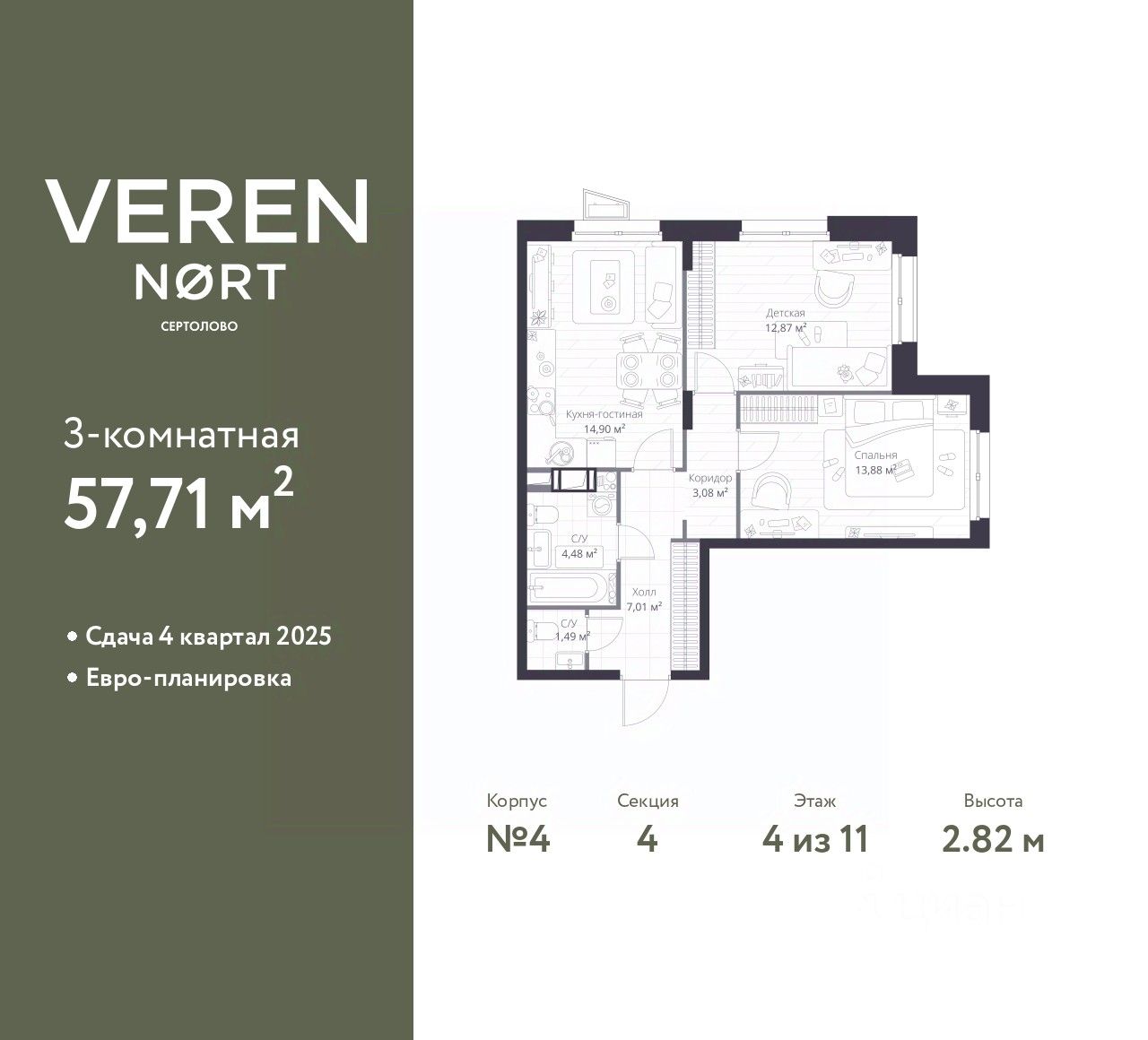 2-комн. квартира от застройщика в Veren Nort Сертолово на 4 этаже. Квартира без отделки, полностью готова к ремонту. Общая площадь: 57.71 кв.м., жилая: 26.75 кв.м., площадь просторной куxни-гостиной: 14.9 кв.м. Угловая квартира, идеально подойдет любителям тишины и панорамных видов. В квартире один совмещенный и один раздельный санузел. Высота потолков 2.82 м.