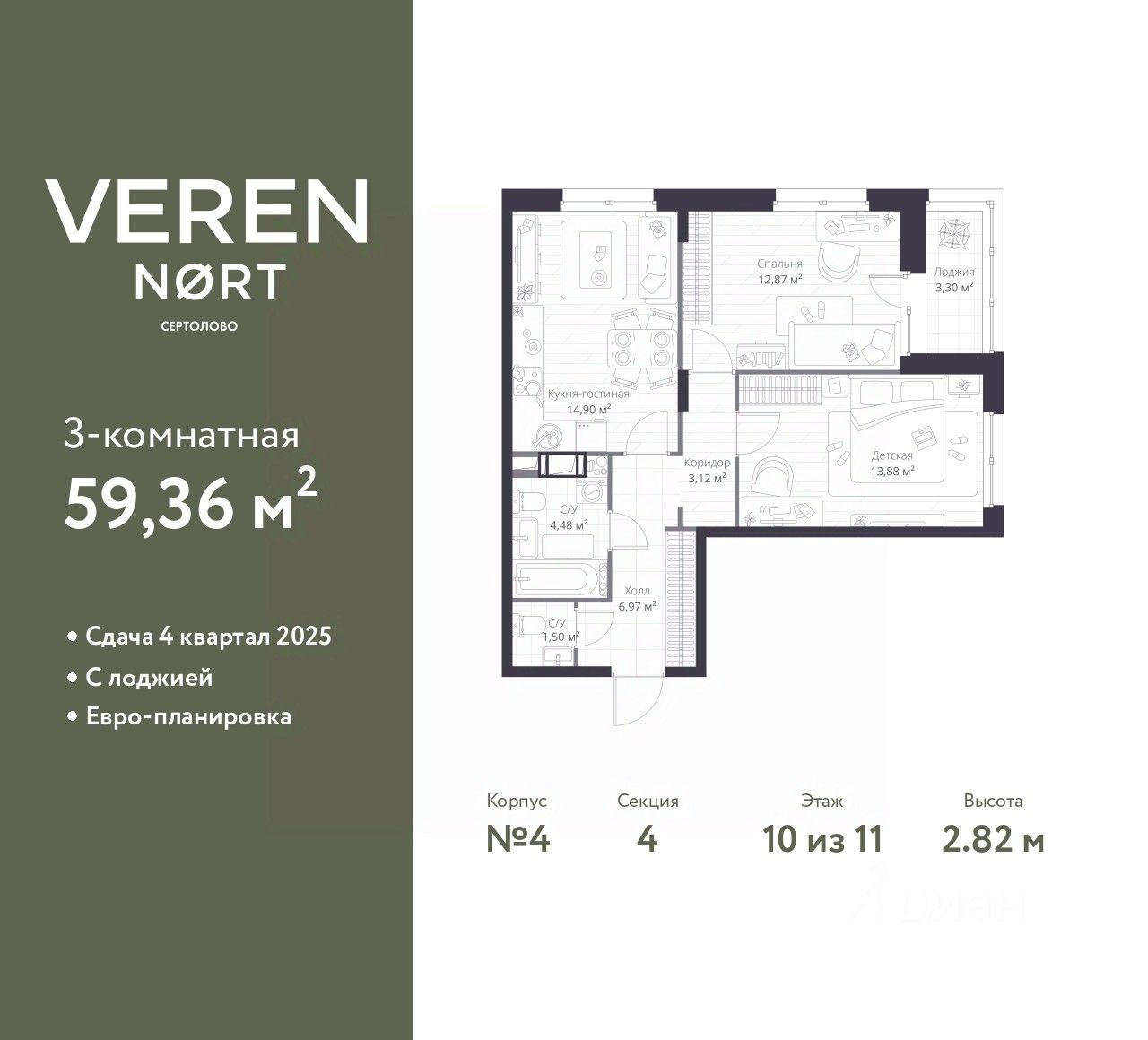 Двухкомнатная квартира от застройщика в Veren Nort Сертолово на 10 этаже. Квартира без отделки, после оформления собственности можно делать ремонт. Общая площадь: 59.36 кв.м., жилая: 26.75 кв.м., площадь просторной куxни-гостиной: 14.9 кв.м. Квартира угловая, идеально подойдет любителям тишины и панорамных видов. В квартире одна лоджия, один совмещенный и один раздельный санузел. Высота потолков 2.82 м.