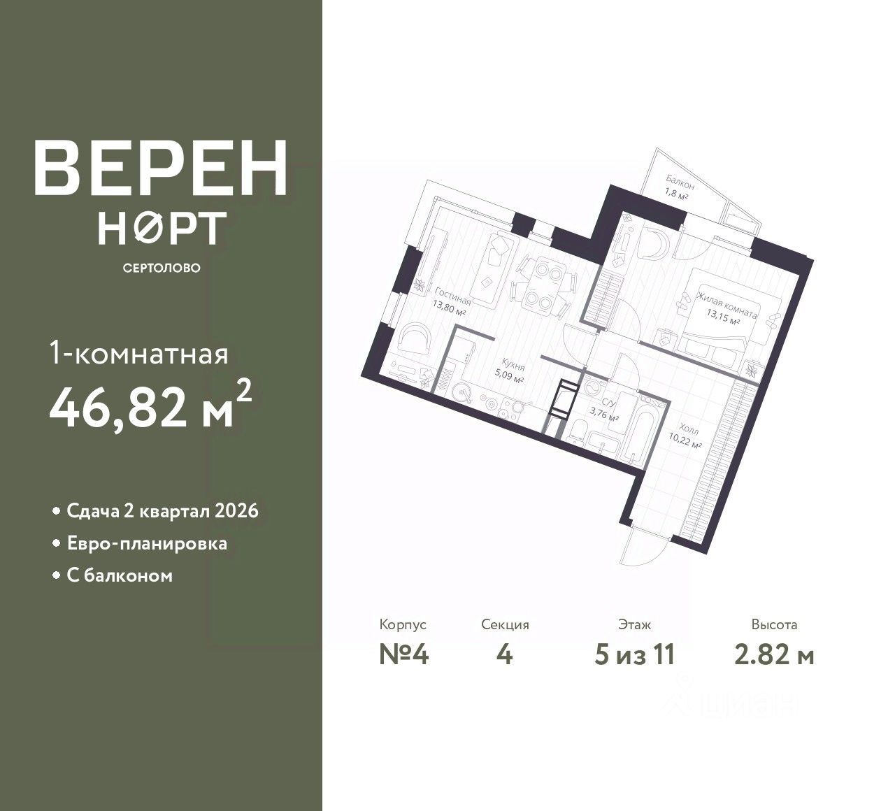 Однокомнатная квартира от застройщика в ЖК "Верен Норт Сертолово" на 5 этаже. Квартира без отделки, после оформления собственности можно делать ремонт. Общая площадь: 46.82 кв.м., жилая: 13.15 кв.м., площадь просторной куxни-гостиной: 18.89 кв.м. Угловая квартира, идеально подойдет любителям тишины и панорамных видов. В квартире один балкон, один совмещенный санузел. Высота потолков 2.82 м.