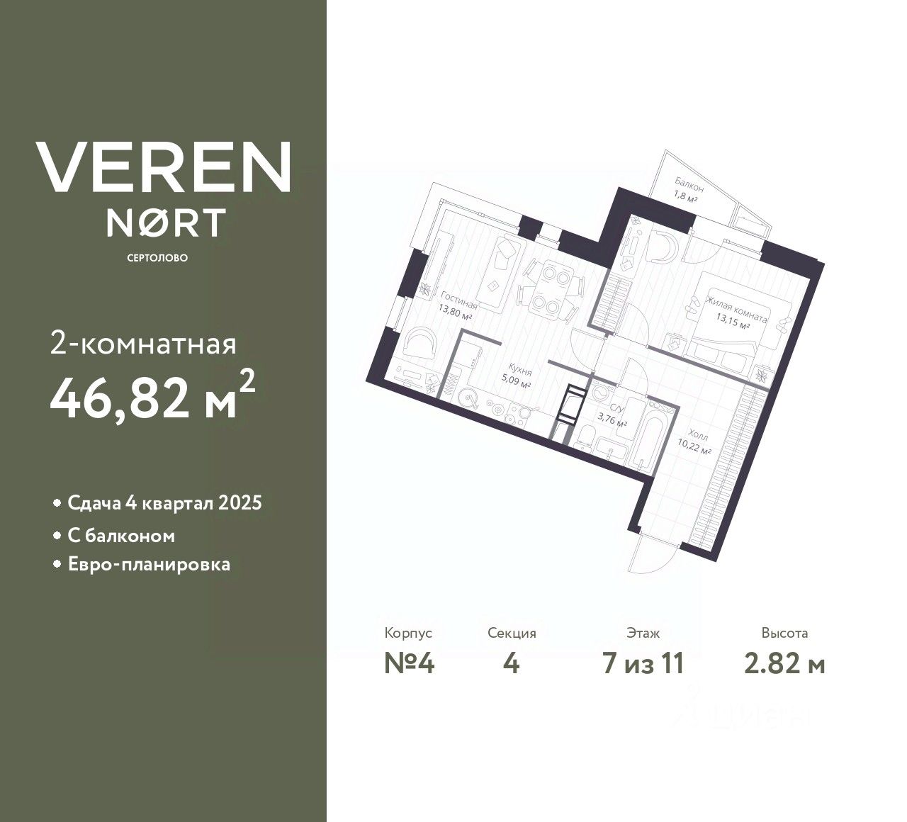 Однокомнатная квартира от застройщика в Veren Nort Сертолово на 7 этаже. Квартира без отделки, полностью готова к ремонту. Общая площадь: 46.82 кв.м., жилая: 13.15 кв.м., площадь просторной куxни-гостиной: 18.89 кв.м. Квартира угловая, очень светлая, естественная вентиляция при открытии окон. В квартире один балкон, один совмещенный санузел. Высота потолков 2.82 м.