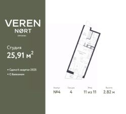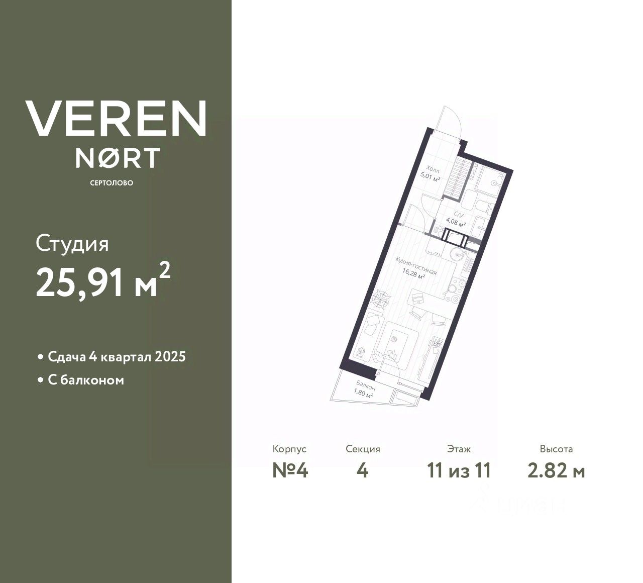 Просторная однокомнатная квартира-студия в Veren Nort Сертолово на 11 этаже. Квартира без отделки, новый собственник может сделать ремонт по индивидуальному дизайн-проекту. Общая площадь: 25.91 кв.м., площадь гостиной 16.28 кв.м., из которых 3 кв.м. выделено под кухонную зону. Все окна выходят на одну сторону. В квартире один балкон, один совмещенный санузел. Высота потолков 2.82 м.