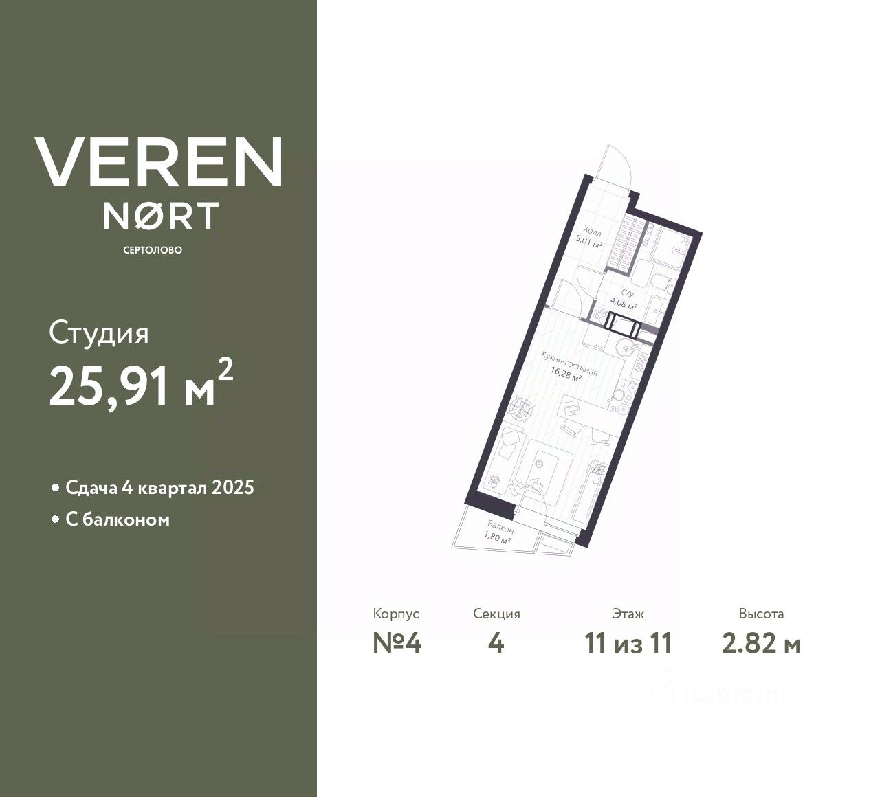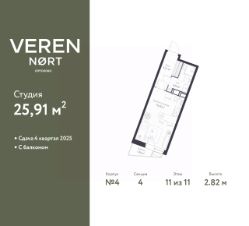 Продается 1-комн. квартира-студия в Veren Nort Сертолово на 11 этаже. Квартира без отделки, после выдачи ключей можно делать ремонт. Общая площадь: 25.91 кв.м., площадь гостиной 16.28 кв.м., из которых 3 кв.м. выделено под кухонную зону. Все окна выходят на одну сторону. В квартире один балкон, один совмещенный санузел. Высота потолков 2.82 м.