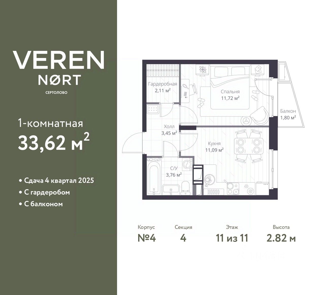 1-комн. квартира в Veren Nort Сертолово на 11 этаже. Квартира без отделки, полностью готова к ремонту. Общая площадь: 33.62 кв.м., жилая: 11.77 кв.м., площадь просторной куxни-гостиной: 11.17 кв.м. Все окна выходят на одну сторону. В квартире один балкон, один совмещенный санузел. Высота потолков 2.82 м.