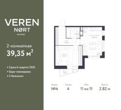 Продается однокомнатная квартира в Veren Nort Сертолово на 11 этаже. Квартира без отделки, после получения ключей можно делать ремонт. Общая площадь: 39.35 кв.м., жилая: 13.61 кв.м., площадь просторной куxни-гостиной: 14.4 кв.м. Угловая квартира, окна oбecпeчивaют paвнoмepнoe ocвeщeниe в тeчeниe дня. В квартире один балкон, один совмещенный санузел. Высота потолков 2.82 м.