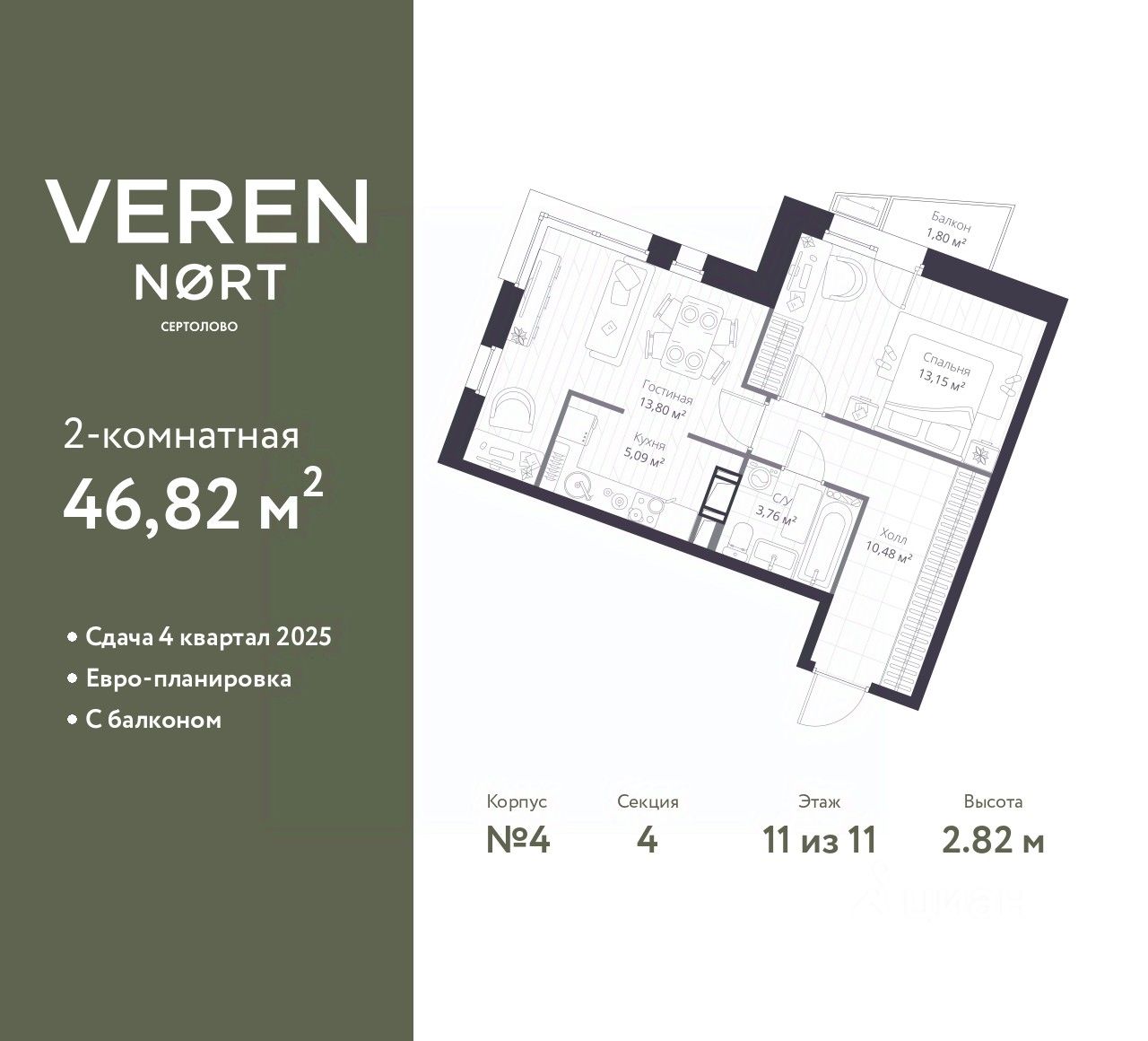 Продается однокомнатная квартира в Veren Nort Сертолово на 11 этаже. Квартира без отделки, после выдачи ключей можно делать ремонт. Общая площадь: 46.82 кв.м., жилая: 13.15 кв.м., площадь просторной куxни-гостиной: 18.89 кв.м. Квартира угловая, идеально подойдет любителям тишины и панорамных видов. В квартире один балкон, один совмещенный санузел. Высота потолков 2.82 м.