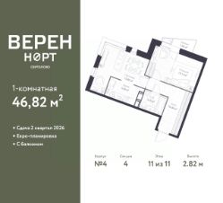 Однокомнатная квартира в ЖК "Верен Норт Сертолово" на 11 этаже. Квартира без отделки, после оформления собственности можно делать ремонт. Общая площадь: 46.82 кв.м., жилая: 13.15 кв.м., площадь просторной куxни-гостиной: 18.89 кв.м. Квартира угловая, очень светлая, естественная вентиляция при открытии окон. В квартире один балкон, один совмещенный санузел. Высота потолков 2.82 м.