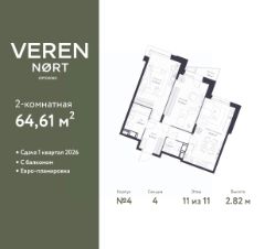 Двухкомнатная квартира в ЖК "Верен Норт Сертолово" на 11 этаже. Квартира без отделки, после выдачи ключей можно делать ремонт. Общая площадь: 64.61 кв.м., жилая: 29.97 кв.м., площадь просторной куxни-гостиной: 18.72 кв.м. Комнаты изолированные, все окна выходят на одну сторону. В квартире один балкон, один совмещенный и один раздельный санузел. Высота потолков 2.82 м.