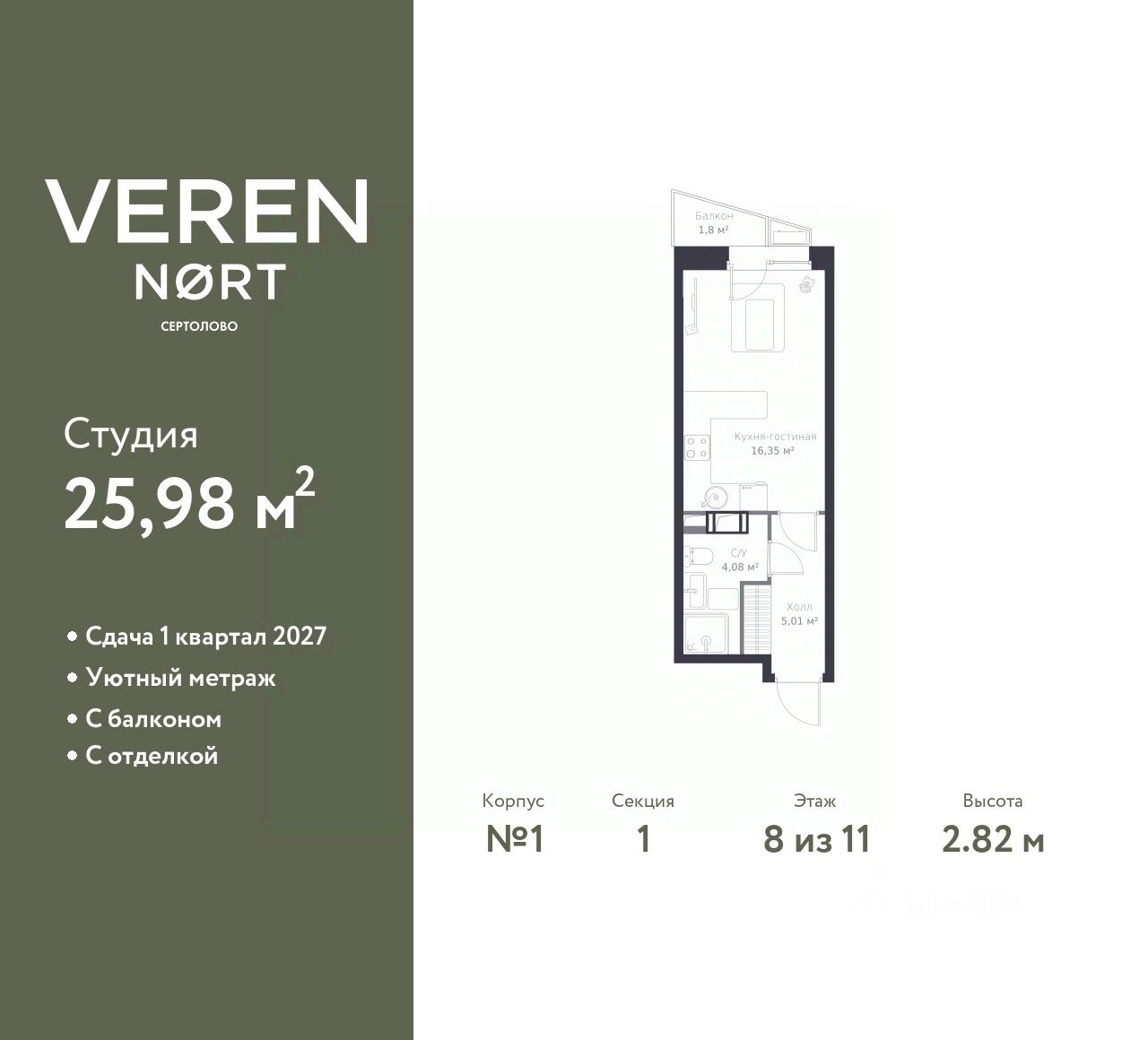 1-комн. квартира-студия в Veren Nort Сертолово на 8 этаже. Квартира без отделки, полностью готова к чистовой отделке и дальнейшему ремонту. Общая площадь: 25.98 кв.м., площадь гостиной 16.35 кв.м., из которых 5 кв.м. выделено под кухонную зону. Все окна выходят на одну сторону. В квартире один балкон, один совмещенный санузел. Высота потолков 2.82 м.