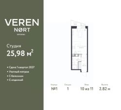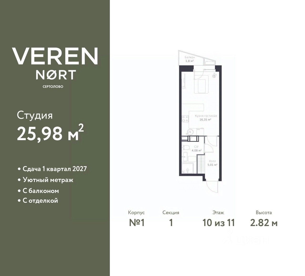 1-комн. квартира-студия в Veren Nort Сертолово на 10 этаже. Квартира без отделки, после оформления собственности можно делать ремонт. Общая площадь: 25.98 кв.м., площадь гостиной 16.35 кв.м., из которых 5 кв.м. выделено под кухонную зону. Все окна выходят на одну сторону. В квартире один балкон, один совмещенный санузел. Высота потолков 2.82 м.
