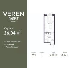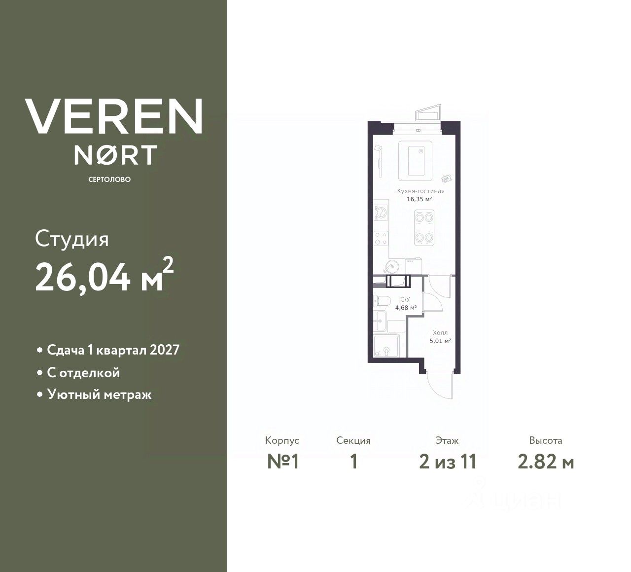 Однокомнатная квартира-студия в Veren Nort Сертолово на 2 этаже. Квартира без отделки, после оформления собственности можно делать ремонт. Общая площадь: 26.04 кв.м., площадь гостиной 16.35 кв.м., из которых 5 кв.м. выделено под кухонную зону. Все окна выходят на одну сторону. В квартире один совмещенный санузел. Высота потолков 2.82 м.
