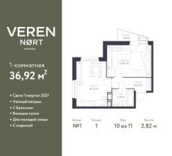 Однокомнатная квартира в Veren Nort Сертолово на 10 этаже. Квартира без отделки, новый владелец может сделать ремонт по своему дизайн-проекту. Общая площадь: 36.92 кв.м., жилая: 13.97 кв.м., площадь просторной куxни-гостиной: 14.22 кв.м. Квартира угловая, очень светлая, естественная вентиляция при открытии окон. В квартире один балкон, один совмещенный санузел. Высота потолков 2.82 м.