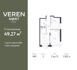 2-комн. квартира в Veren Nort Сертолово на 2 этаже. Квартира без отделки, после получения ключей можно делать ремонт. Общая площадь: 49.27 кв.м., жилая: 24.81 кв.м., площадь просторной куxни-гостиной: 13.77 кв.м. Квартира угловая, очень светлая, естественная вентиляция при открытии окон. В квартире один совмещенный санузел. Высота потолков 2.82 м.