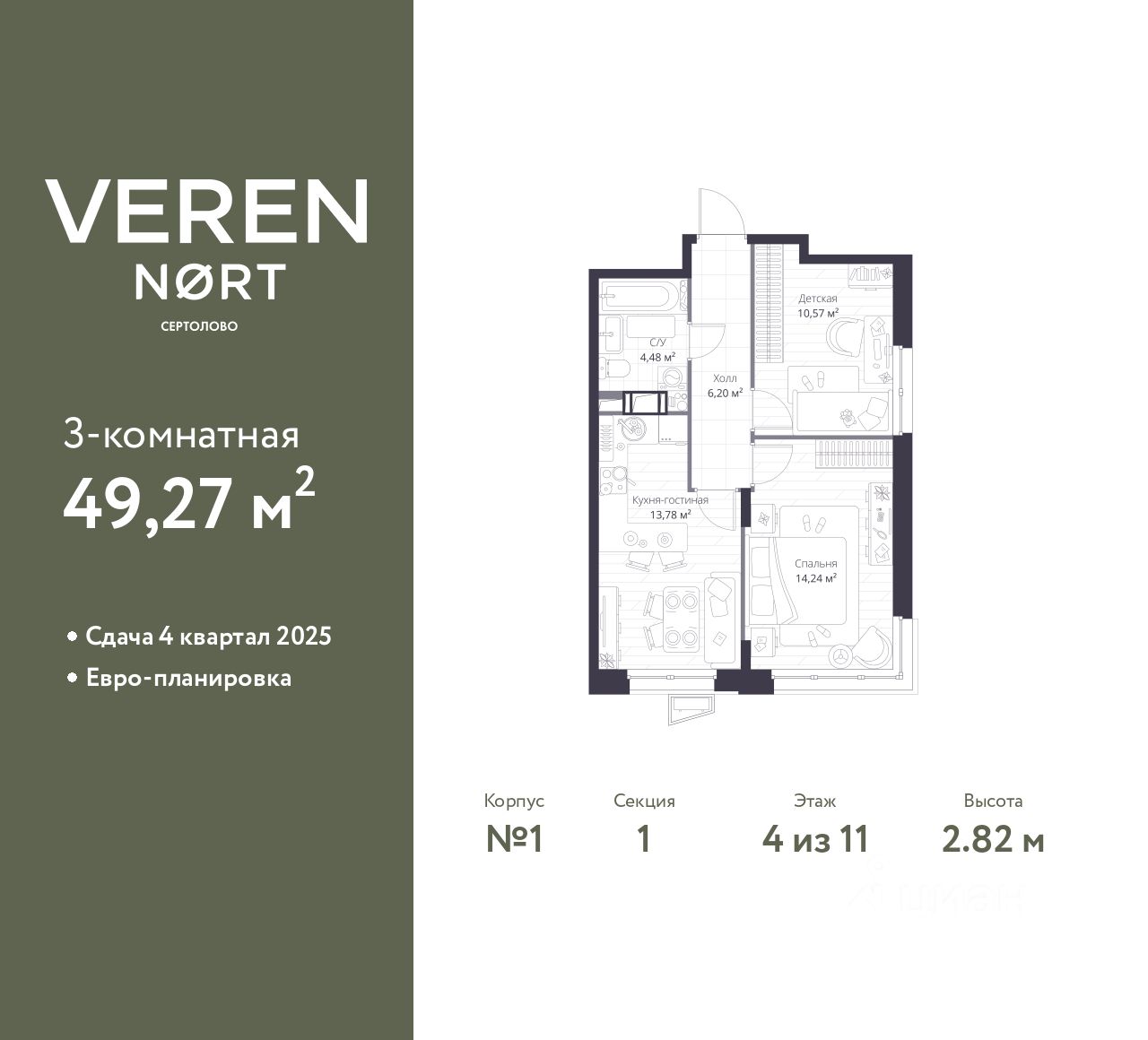 Продается двухкомнатная квартира от застройщика в Veren Nort Сертолово на 4 этаже. Квартира без отделки, после оформления собственности можно делать ремонт. Общая площадь: 49.27 кв.м., жилая: 24.81 кв.м., площадь просторной куxни-гостиной: 13.77 кв.м. Угловая квартира, очень светлая, естественная вентиляция при открытии окон. В квартире один совмещенный санузел. Высота потолков 2.82 м.