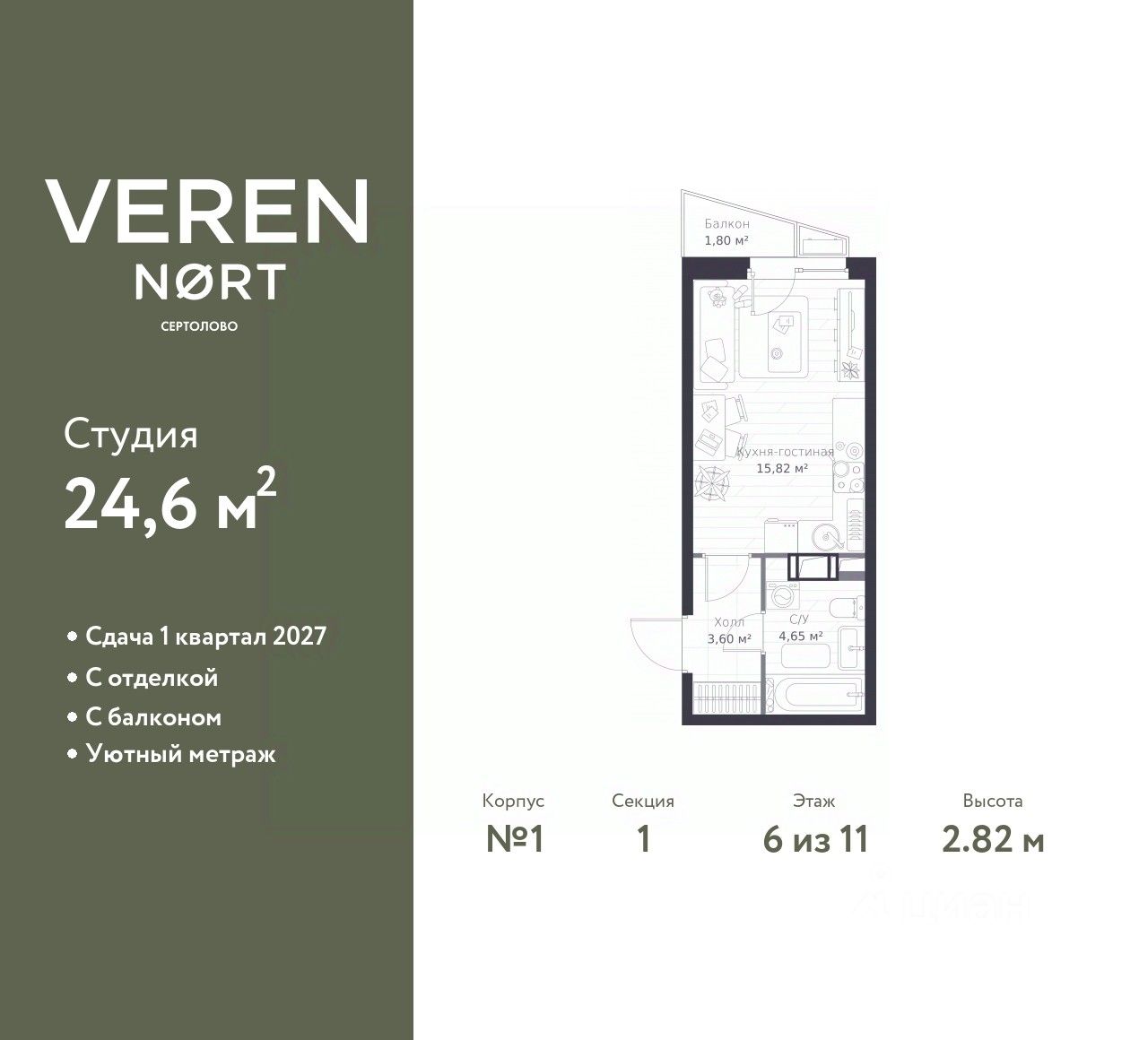 1-комн. квартира-студия от застройщика в Veren Nort Сертолово на 6 этаже. Квартира без отделки, после получения ключей можно делать ремонт. Общая площадь: 24.6 кв.м., площадь гостиной 15.82 кв.м., из которых 5 кв.м. выделено под кухонную зону. Все окна выходят на одну сторону. В квартире один балкон, один совмещенный санузел. Высота потолков 2.82 м.