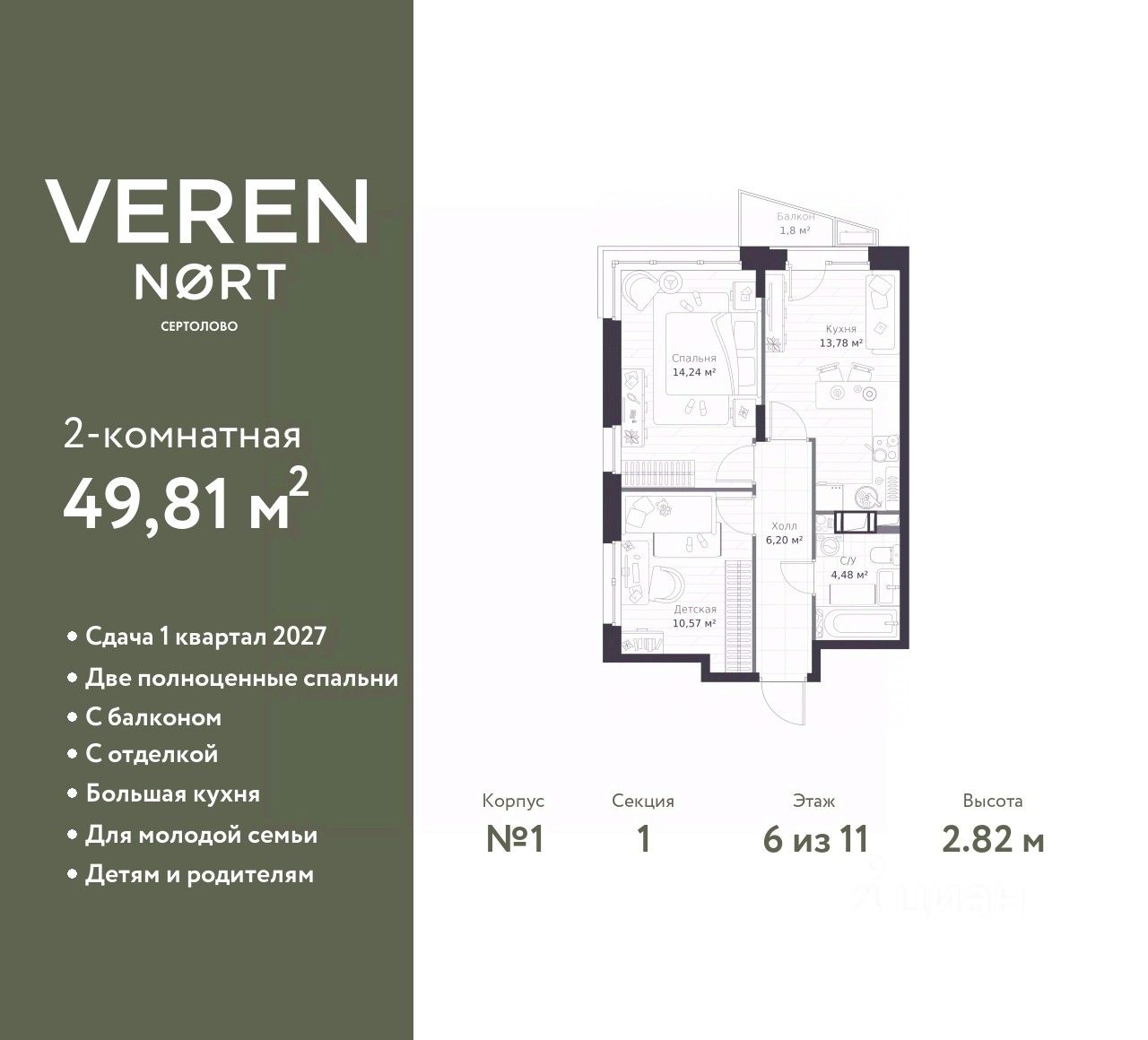 2-комн. квартира от застройщика в Veren Nort Сертолово на 6 этаже. Квартира без отделки, полностью готова к ремонту. Общая площадь: 49.81 кв.м., жилая: 24.81 кв.м., площадь просторной куxни-гостиной: 13.78 кв.м. Угловая квартира, очень светлая, естественная вентиляция при открытии окон. В квартире один балкон, один совмещенный санузел. Высота потолков 2.82 м.
