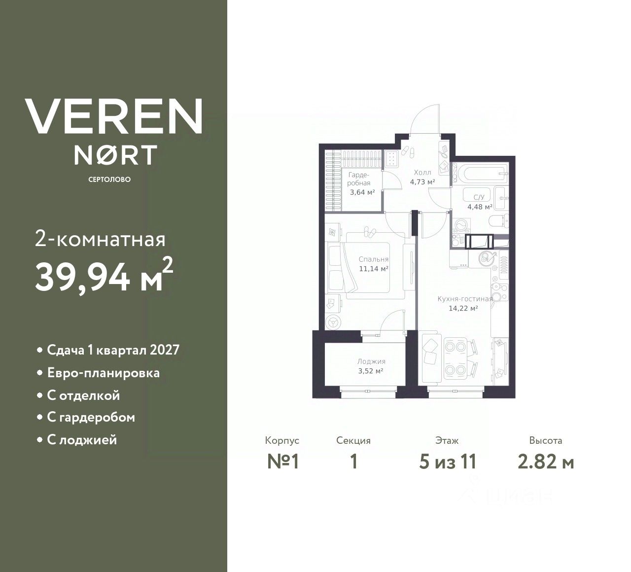 Просторная 1-комн. квартира в Veren Nort Сертолово на 5 этаже. Квартира без отделки, полностью готова к ремонту. Общая площадь: 39.94 кв.м., жилая: 11.14 кв.м., площадь просторной куxни-гостиной: 14.22 кв.м. Все окна выходят на одну сторону. В квартире одна лоджия, один совмещенный санузел. Высота потолков 2.82 м.