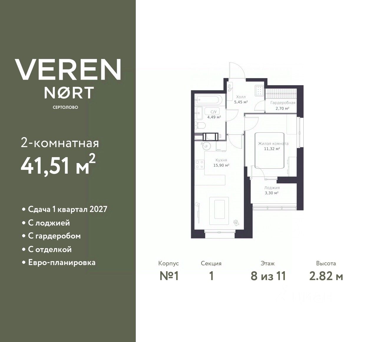 1-комн. квартира в Veren Nort Сертолово на 8 этаже. Квартира без отделки, после оформления собственности можно делать ремонт. Общая площадь: 41.51 кв.м., жилая: 11.32 кв.м., площадь просторной куxни-гостиной: 15.9 кв.м. Квартира угловая, очень светлая, естественная вентиляция при открытии окон. В квартире одна лоджия, один совмещенный санузел. Высота потолков 2.82 м.