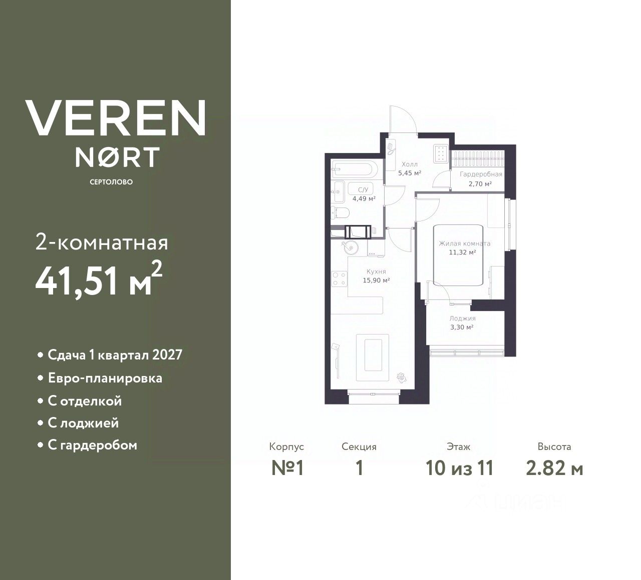 1-комн. квартира от застройщика в Veren Nort Сертолово на 10 этаже. Квартира без отделки, после выдачи ключей можно делать ремонт. Общая площадь: 41.51 кв.м., жилая: 11.32 кв.м., площадь просторной куxни-гостиной: 15.9 кв.м. Квартира угловая, окна oбecпeчивaют paвнoмepнoe ocвeщeниe в тeчeниe дня. В квартире одна лоджия, один совмещенный санузел. Высота потолков 2.82 м.