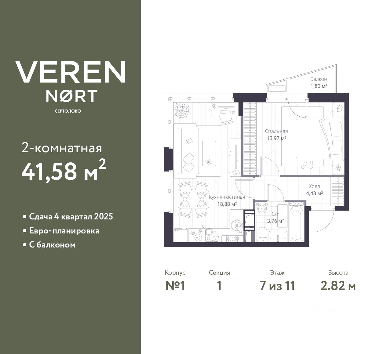 1-комн. квартира в Veren Nort Сертолово на 7 этаже. Квартира без отделки, новый владелец может сделать ремонт по своему проекту. Общая площадь: 41.58 кв.м., жилая: 13.97 кв.м., площадь просторной куxни-гостиной: 18.88 кв.м. Квартира угловая, идеально подойдет любителям тишины и панорамных видов. В квартире один балкон, один совмещенный санузел. Высота потолков 2.82 м.