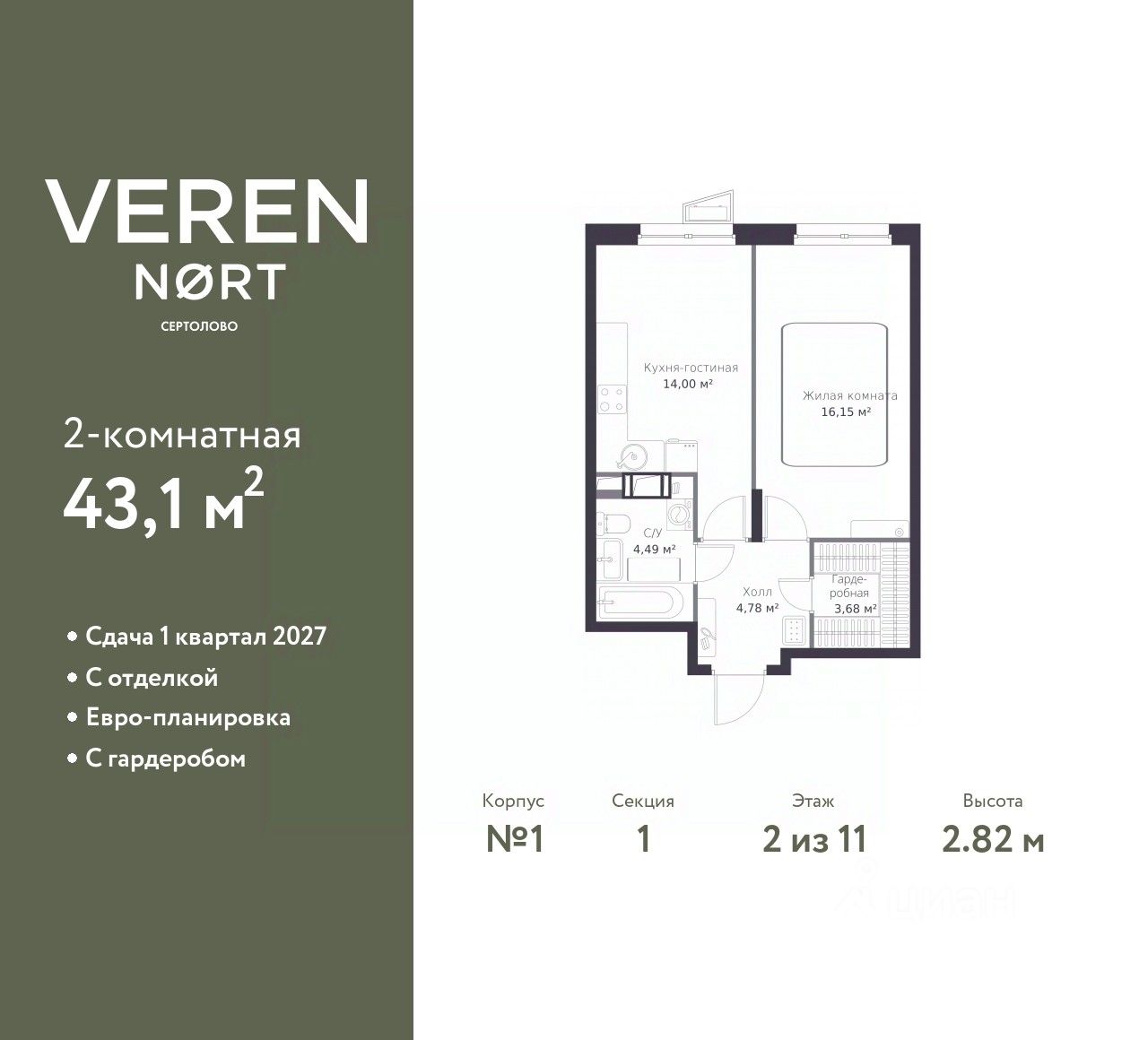 1-комн. квартира от застройщика в Veren Nort Сертолово на 2 этаже. Квартира без отделки, после оформления собственности можно делать ремонт. Общая площадь: 43.1 кв.м., жилая: 16.15 кв.м., площадь просторной куxни-гостиной: 14 кв.м. Все окна выходят на одну сторону. В квартире один совмещенный санузел. Высота потолков 2.82 м.