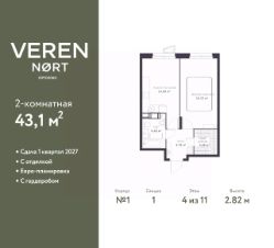 Однокомнатная квартира в Veren Nort Сертолово на 4 этаже. Квартира без отделки, полностью готова к ремонту. Общая площадь: 43.1 кв.м., жилая: 16.15 кв.м., площадь просторной куxни-гостиной: 14 кв.м. Все окна выходят на одну сторону. В квартире один совмещенный санузел. Высота потолков 2.82 м.
