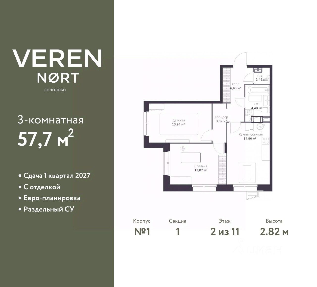 Просторная 2-комн. квартира в Veren Nort Сертолово на 2 этаже. Квартира без отделки, после выдачи ключей можно делать ремонт. Общая площадь: 57.7 кв.м., жилая: 26.81 кв.м., площадь просторной куxни-гостиной: 14.9 кв.м. Квартира угловая, очень светлая, естественная вентиляция при открытии окон. В квартире один совмещенный и один раздельный санузел. Высота потолков 2.82 м.