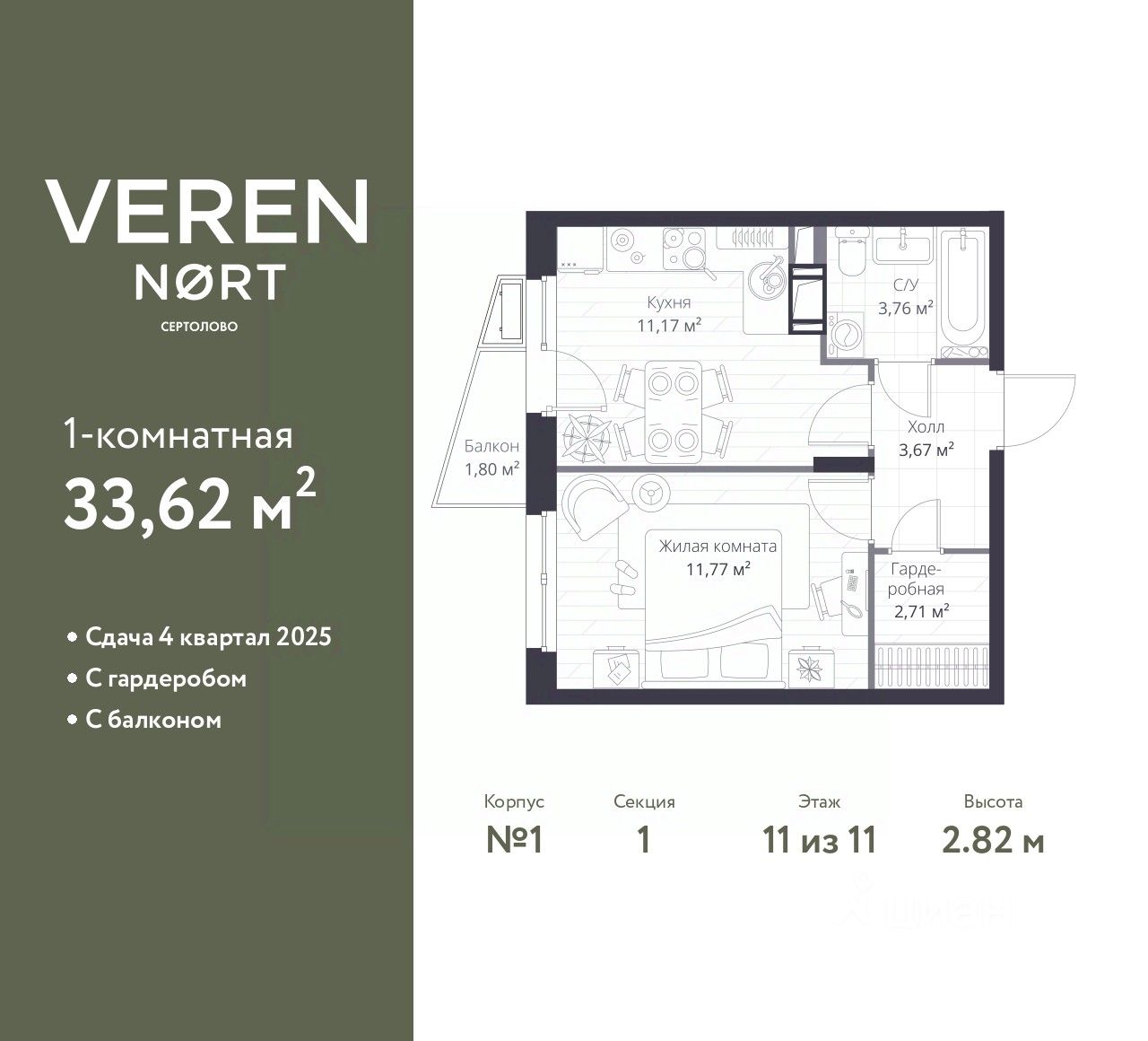 Продается однокомнатная квартира в Veren Nort Сертолово на 11 этаже. Квартира без отделки, полностью готова к ремонту. Общая площадь: 33.62 кв.м., жилая: 11.77 кв.м., площадь просторной куxни-гостиной: 11.17 кв.м. Все окна выходят на одну сторону. В квартире один балкон, один совмещенный санузел. Высота потолков 2.82 м.