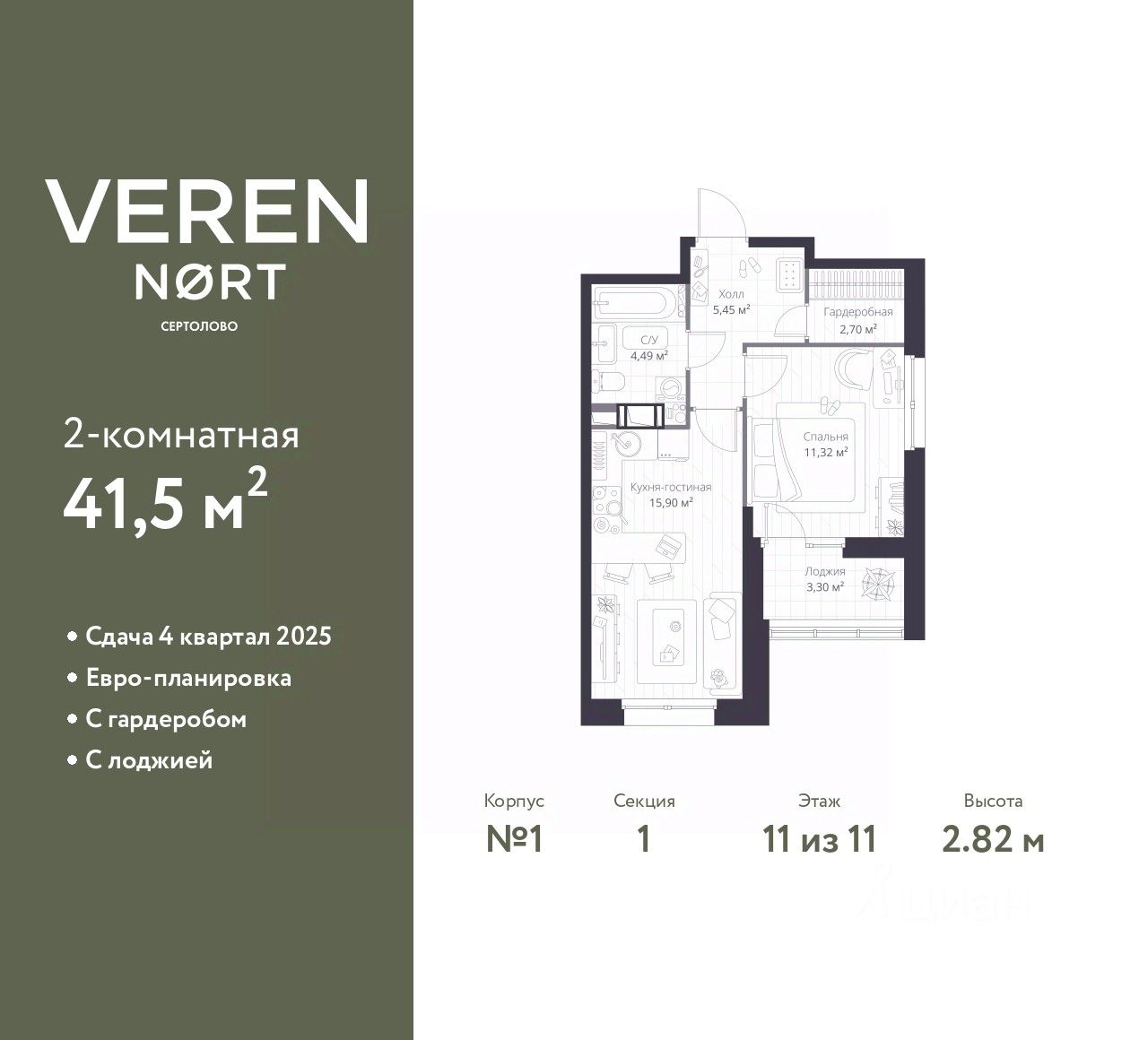 1-комн. квартира от застройщика в Veren Nort Сертолово на 11 этаже. Квартира без отделки, полностью готова к чистовой отделке и дальнейшему ремонту. Общая площадь: 41.5 кв.м., жилая: 11.32 кв.м., площадь просторной куxни-гостиной: 15.9 кв.м. Угловая квартира, очень светлая, естественная вентиляция при открытии окон. В квартире одна лоджия, один совмещенный санузел. Высота потолков 2.82 м.