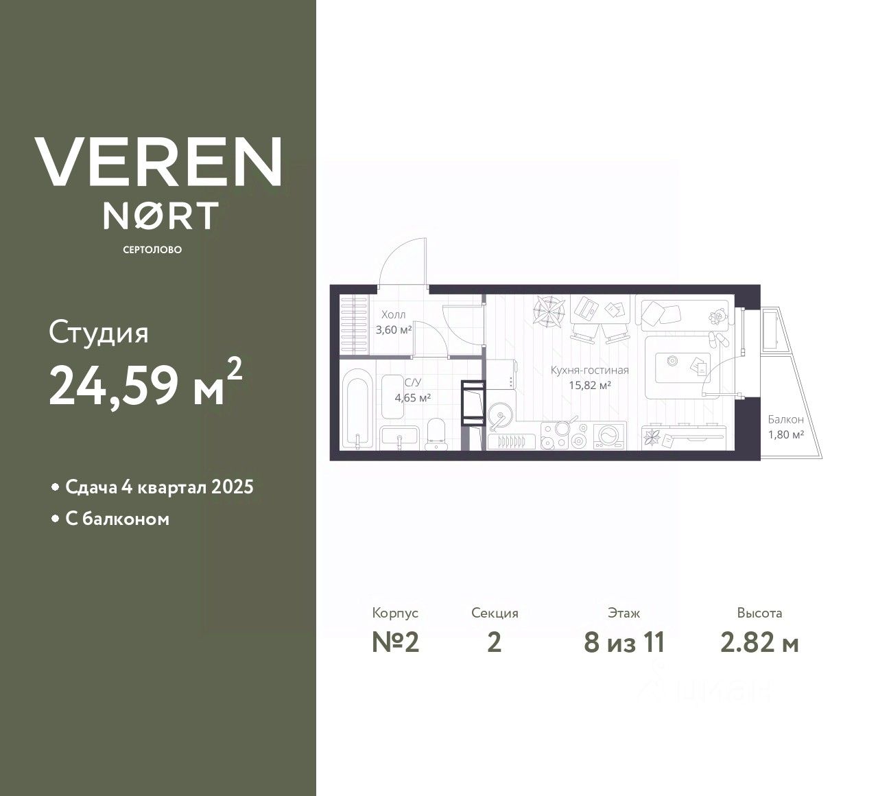 Продается 1-комн. квартира-студия в Veren Nort Сертолово на 8 этаже. Квартира без отделки, новый владелец может сделать ремонт по индивидуальному проекту. Общая площадь: 24.59 кв.м., площадь гостиной 15.82 кв.м., из которых 3 кв.м. выделено под кухонную зону. Все окна выходят на одну сторону. В квартире один балкон, один совмещенный санузел. Высота потолков 2.82 м.