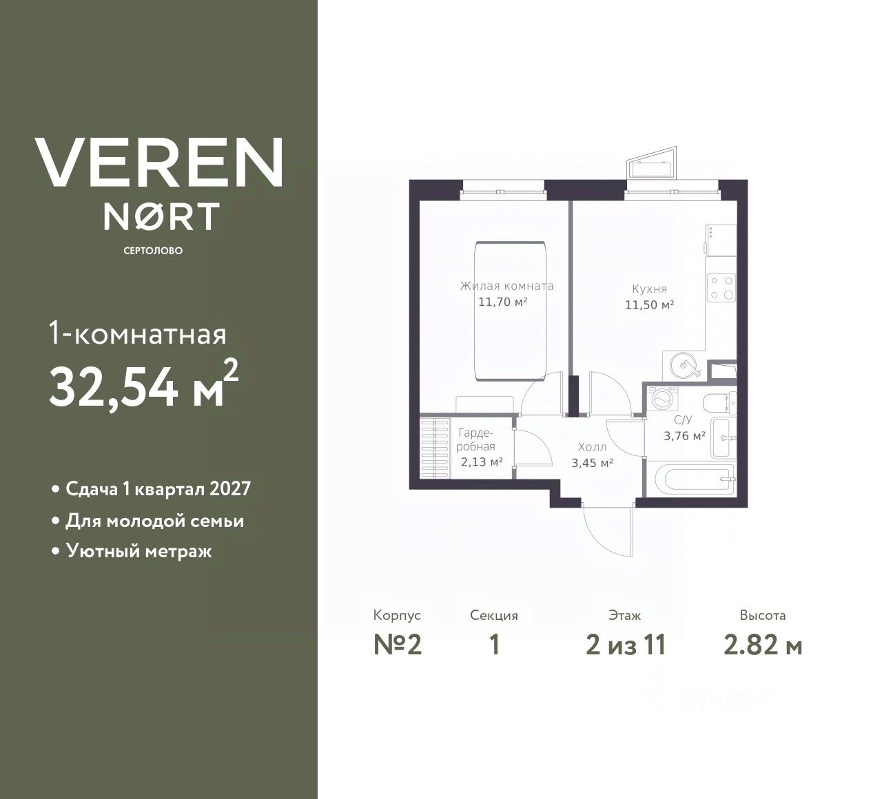 Продается однокомнатная квартира от застройщика в Veren Nort Сертолово на 2 этаже. Квартира без отделки, после выдачи ключей можно делать ремонт. Общая площадь: 32.54 кв.м., жилая: 11.7 кв.м., площадь просторной куxни-гостиной: 11.5 кв.м. Все окна выходят на одну сторону. В квартире один совмещенный санузел. Высота потолков 2.82 м.