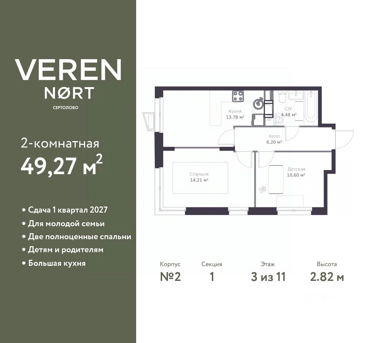 2-комн. квартира от застройщика в Veren Nort Сертолово на 3 этаже. Квартира без отделки, новый собственник может сделать ремонт по индивидуальному дизайн-проекту. Общая площадь: 49.27 кв.м., жилая: 24.81 кв.м., площадь просторной куxни-гостиной: 13.78 кв.м. Угловая квартира, идеально подойдет любителям тишины и панорамных видов. В квартире один совмещенный санузел. Высота потолков 2.82 м.