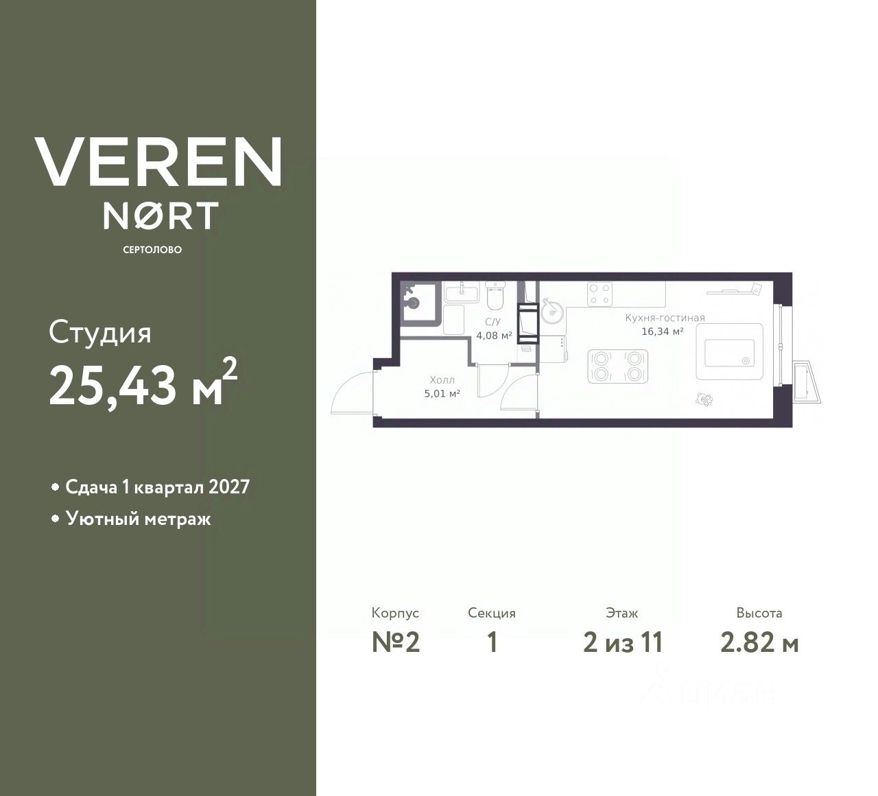 1-комн. квартира-студия в Veren Nort Сертолово на 2 этаже. Квартира без отделки, новый владелец может сделать ремонт по индивидуальному дизайн-проекту. Общая площадь: 25.43 кв.м., площадь гостиной 16.34 кв.м., из которых 3 кв.м. выделено под кухонную зону. Все окна выходят на одну сторону. В квартире один совмещенный санузел. Высота потолков 2.82 м.