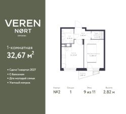 Просторная 1-комн. квартира в Veren Nort Сертолово на 9 этаже. Квартира без отделки, после получения ключей можно делать ремонт. Общая площадь: 32.67 кв.м., жилая: 11.69 кв.м., площадь просторной куxни-гостиной: 11.12 кв.м. Все окна выходят на одну сторону. В квартире один балкон, один совмещенный санузел. Высота потолков 2.82 м.