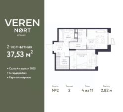 Однокомнатная квартира от застройщика в Veren Nort Сертолово на 4 этаже. Квартира без отделки, полностью готова к чистовой отделке и дальнейшему ремонту. Общая площадь: 37.53 кв.м., жилая: 11.02 кв.м., площадь просторной куxни-гостиной: 14.01 кв.м. Все окна выходят на одну сторону. В квартире один совмещенный санузел. Высота потолков 2.82 м.