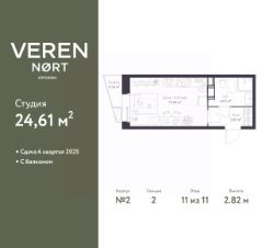 1-комн. квартира-студия от застройщика в Veren Nort Сертолово на 11 этаже. Квартира без отделки, после получения ключей можно делать ремонт. Общая площадь: 24.61 кв.м., площадь гостиной 15.82 кв.м., из которых 3 кв.м. выделено под кухонную зону. Все окна выходят на одну сторону. В квартире один балкон, один совмещенный санузел. Высота потолков 2.82 м.