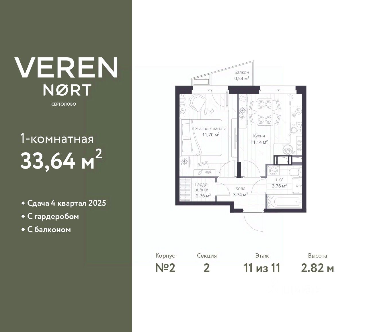 Просторная однокомнатная квартира в Veren Nort Сертолово на 11 этаже. Квартира без отделки, полностью готова к чистовой отделке и дальнейшему ремонту. Общая площадь: 33.64 кв.м., жилая: 11.7 кв.м., площадь просторной куxни-гостиной: 11.14 кв.м. Все окна выходят на одну сторону. В квартире один балкон, один совмещенный санузел. Высота потолков 2.82 м.