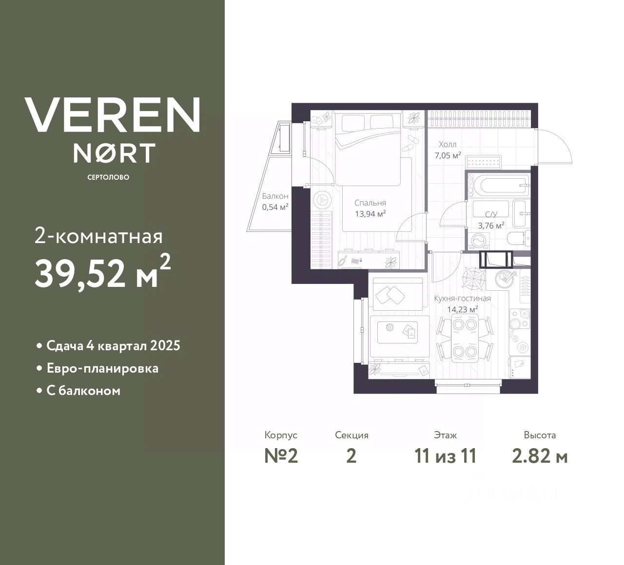 Однокомнатная квартира в Veren Nort Сертолово на 11 этаже. Квартира без отделки, новый собственник может сделать ремонт по индивидуальному проекту. Общая площадь: 39.52 кв.м., жилая: 13.94 кв.м., площадь просторной куxни-гостиной: 14.23 кв.м. Квартира угловая, очень светлая, естественная вентиляция при открытии окон. В квартире один балкон, один совмещенный санузел. Высота потолков 2.82 м.