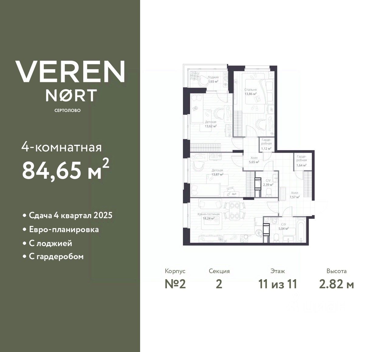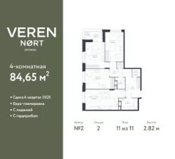 3-комн. квартира от застройщика в Veren Nort Сертолово на 11 этаже. Квартира без отделки, полностью готова к чистовой отделке и дальнейшему ремонту. Общая площадь: 84.65 кв.м., жилая: 41.35 кв.м., площадь просторной куxни-гостиной: 18.24 кв.м. Угловая квартира, очень светлая, естественная вентиляция при открытии окон. В квартире одна лоджия, один совмещенный и один раздельный санузел. Высота потолков 2.82 м.