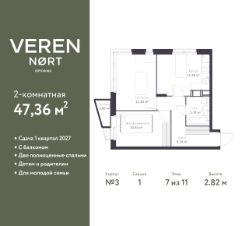 Просторная двухкомнатная квартира в Veren Nort Сертолово на 7 этаже. Квартира без отделки, после выдачи ключей можно делать ремонт. Общая площадь: 47.36 кв.м., жилая: 23.32 кв.м., площадь просторной куxни-гостиной: 11.4 кв.м. Квартира угловая, очень светлая, естественная вентиляция при открытии окон. В квартире один балкон, один совмещенный санузел. Высота потолков 2.82 м.
