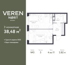 1-комн. квартира от застройщика в Veren Nort Сертолово на 4 этаже. Квартира без отделки, полностью готова к ремонту. Общая площадь: 38.48 кв.м., жилая: 13.73 кв.м., площадь просторной куxни-гостиной: 14.84 кв.м. Все окна выходят на одну сторону. В квартире один совмещенный санузел. Высота потолков 2.82 м.