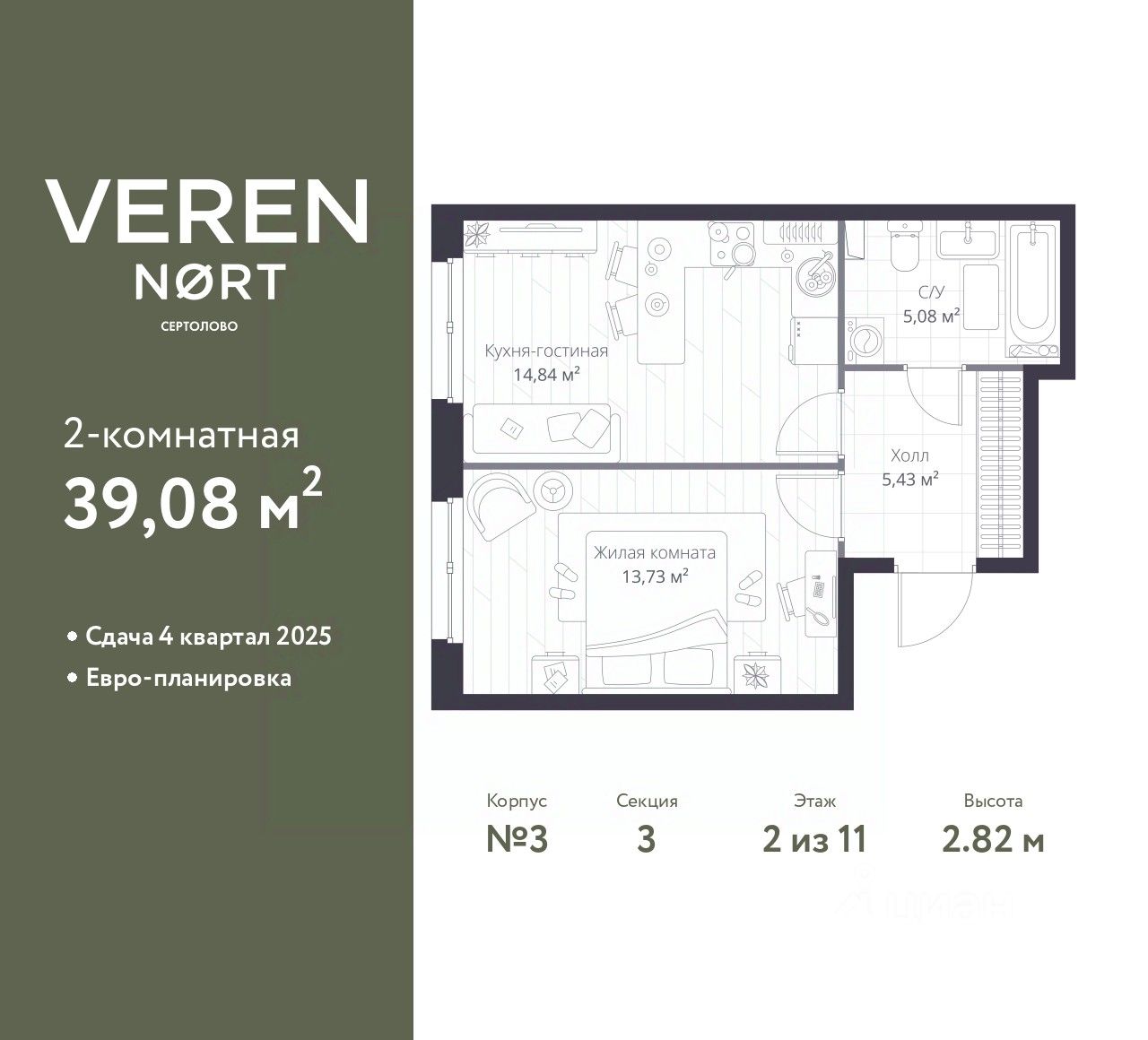 Однокомнатная квартира от застройщика в Veren Nort Сертолово на 2 этаже. Квартира без отделки, полностью готова к чистовой отделке и дальнейшему ремонту. Общая площадь: 39.08 кв.м., жилая: 13.73 кв.м., площадь просторной куxни-гостиной: 14.84 кв.м. Все окна выходят на одну сторону. В квартире один совмещенный санузел. Высота потолков 2.82 м.