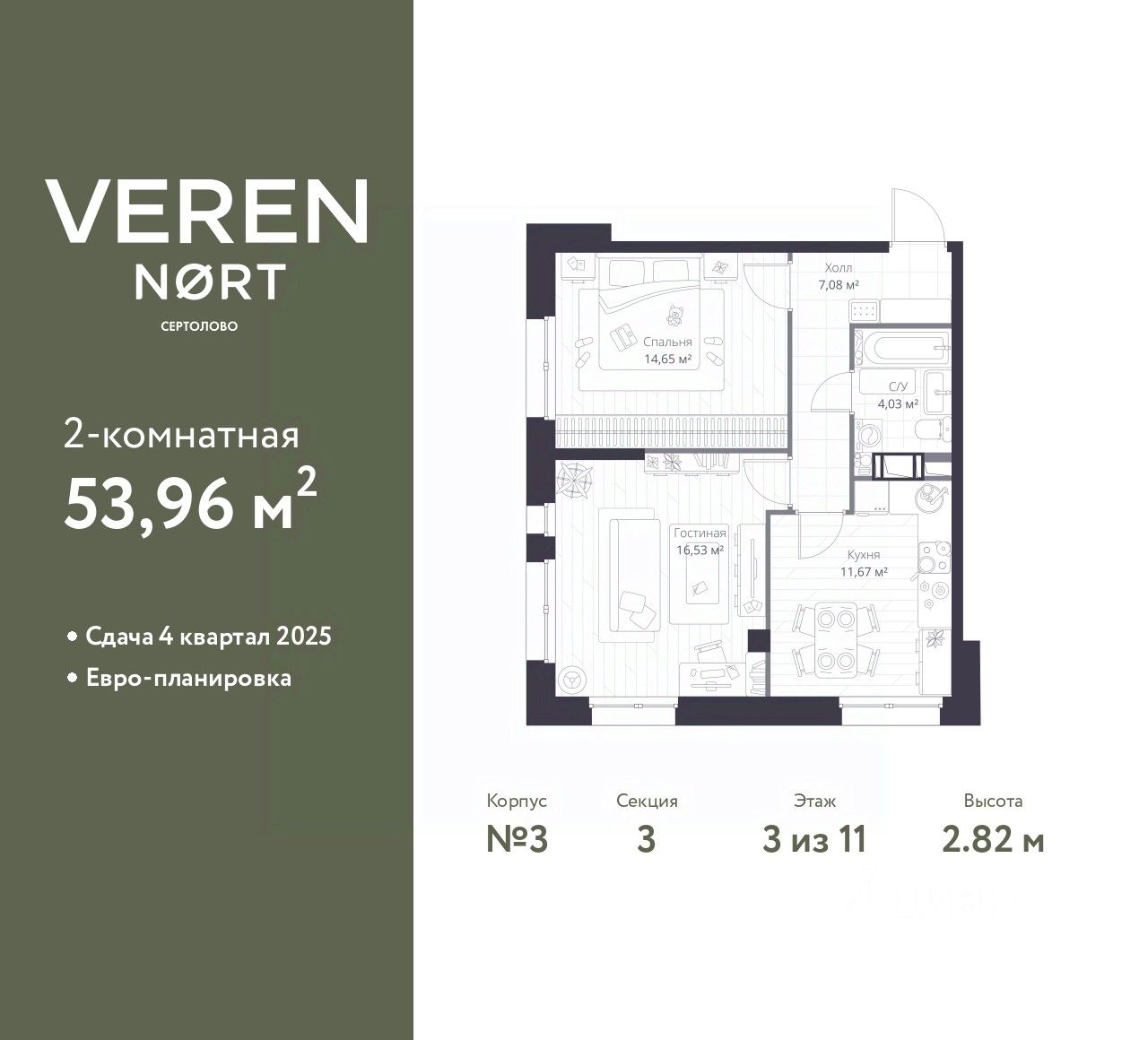 2-комн. квартира от застройщика в Veren Nort Сертолово на 3 этаже. Квартира без отделки, новый собственник может сделать ремонт по своему проекту. Общая площадь: 53.96 кв.м., жилая: 31.18 кв.м., площадь просторной куxни-гостиной: 11.67 кв.м. Квартира угловая, очень светлая, естественная вентиляция при открытии окон. В квартире один совмещенный санузел. Высота потолков 2.82 м.